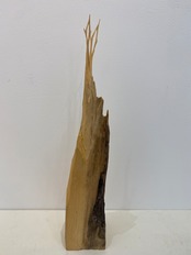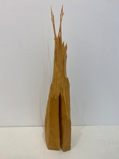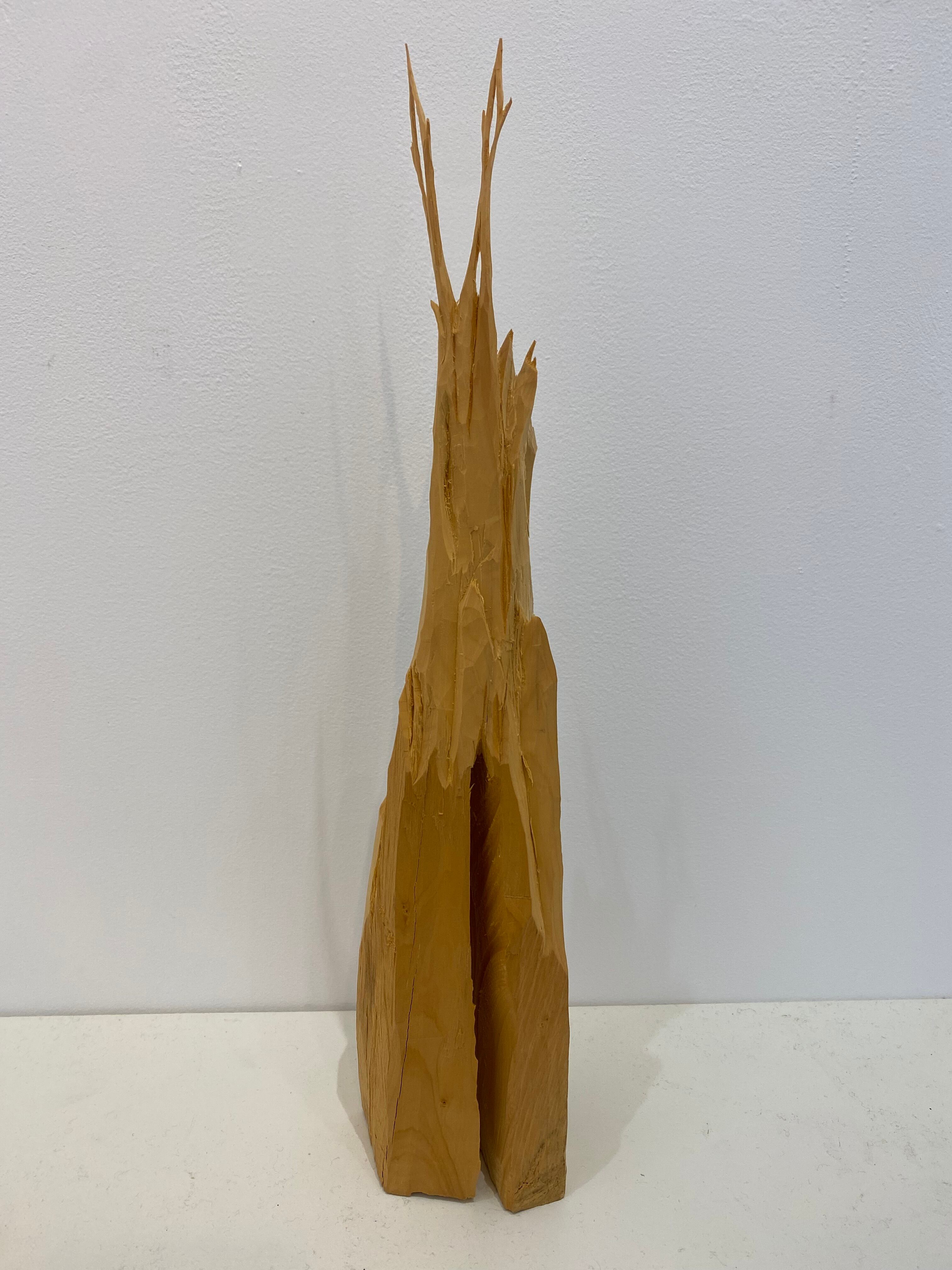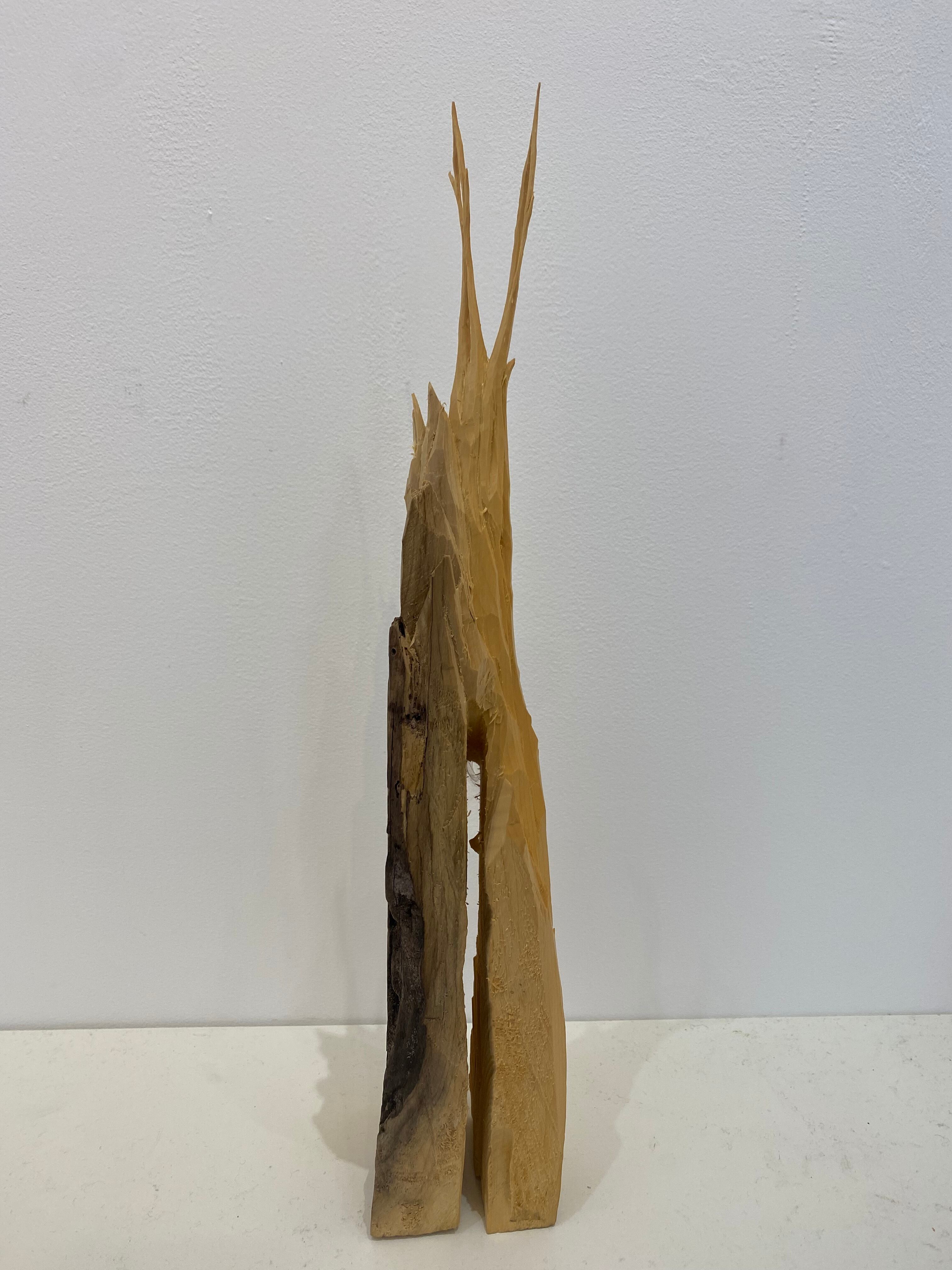 その過程は決して穏やかではありません。作家は木に向き合い、叫び、唸り、格闘しながら、自らが求める形と素材が宿す形との狭間に身を置きます。仕上げられた作品は、あえて罅や毛羽立ちを残したまま展示されます。未完成のまま呼吸する作品は、今もなお変容を続け、作家の問いかけに応じるかのように空間の中で姿を変えていきます。