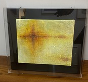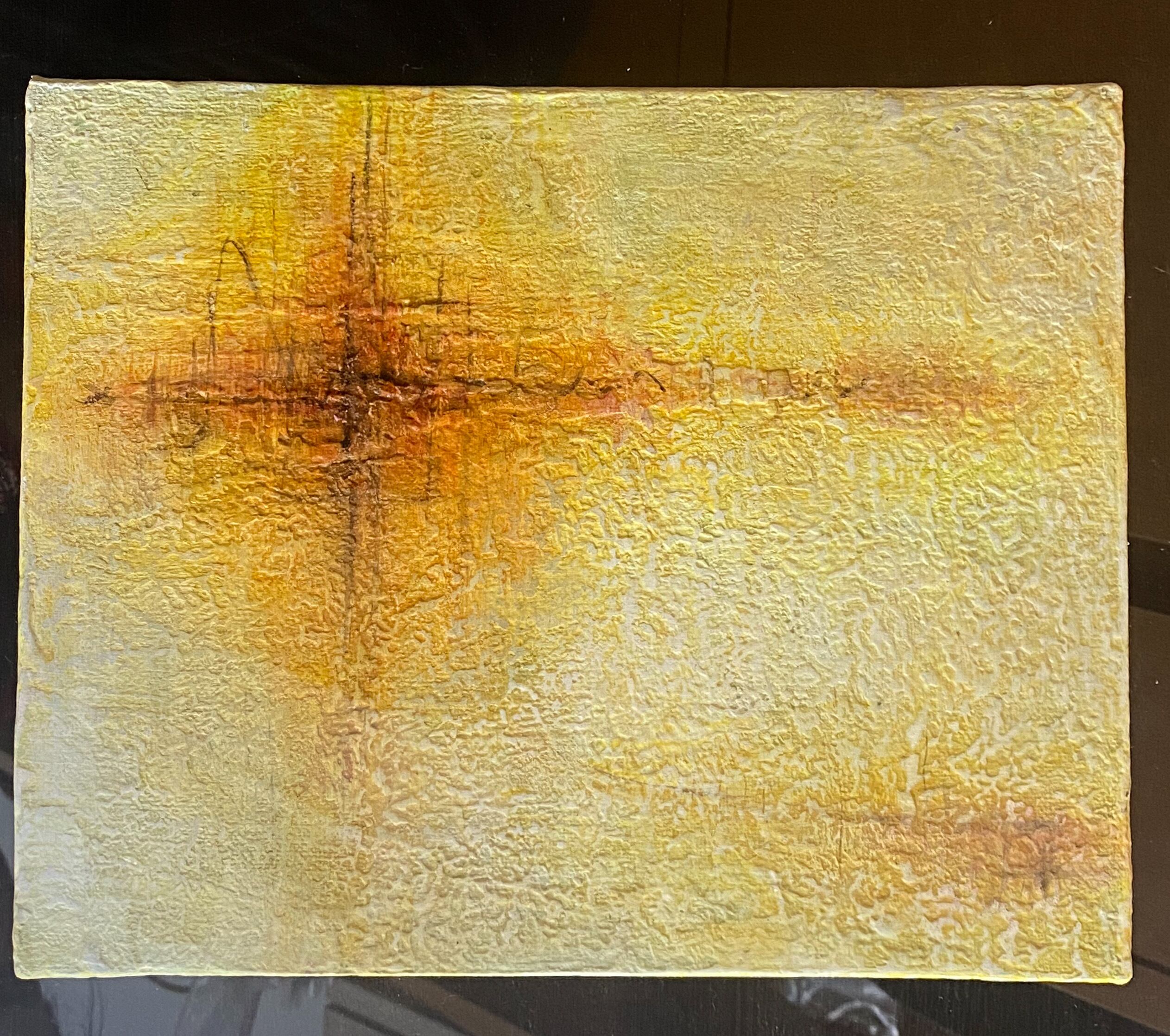 画面全体を覆う黄の柔らかな層は、光そのものが息づいているかのように広がり、観る者を温かな包容感で包み込みます。その中央には赤褐色の線が垂直と水平に交差し、まるで光が空間を横切る瞬間や、心の奥底に残る記憶の残響を象徴しているかのようです。