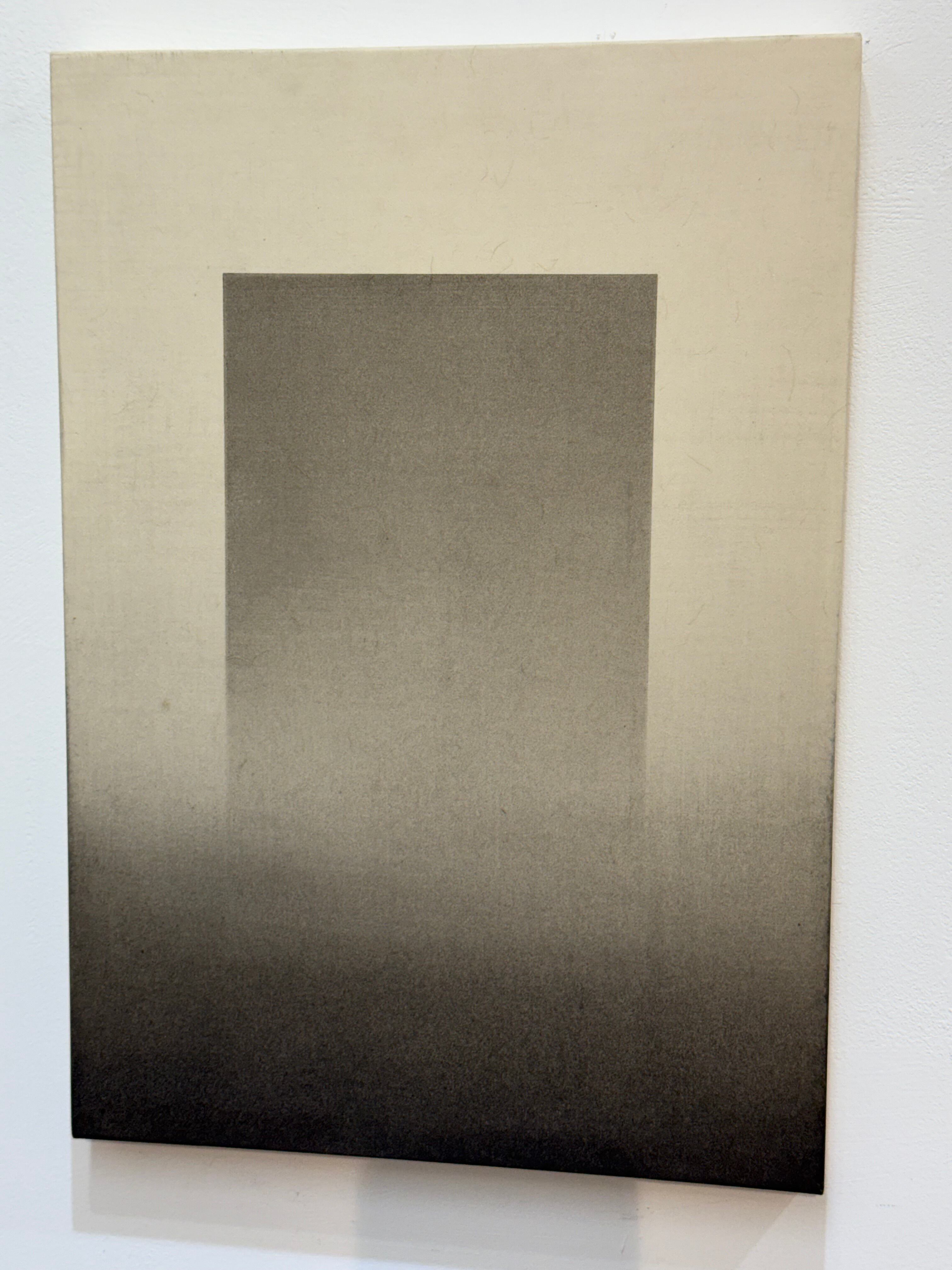 手漉き和紙に四種の墨を使いマスキングでレイヤーを重ねてゆく作品は、和紙と墨が持つ有機質性と正確にマスキングされた線の無機質性が無意識と意識を画面上に同居させ、更に四種の墨のそれぞれの特徴と濃淡が効果を上げる。